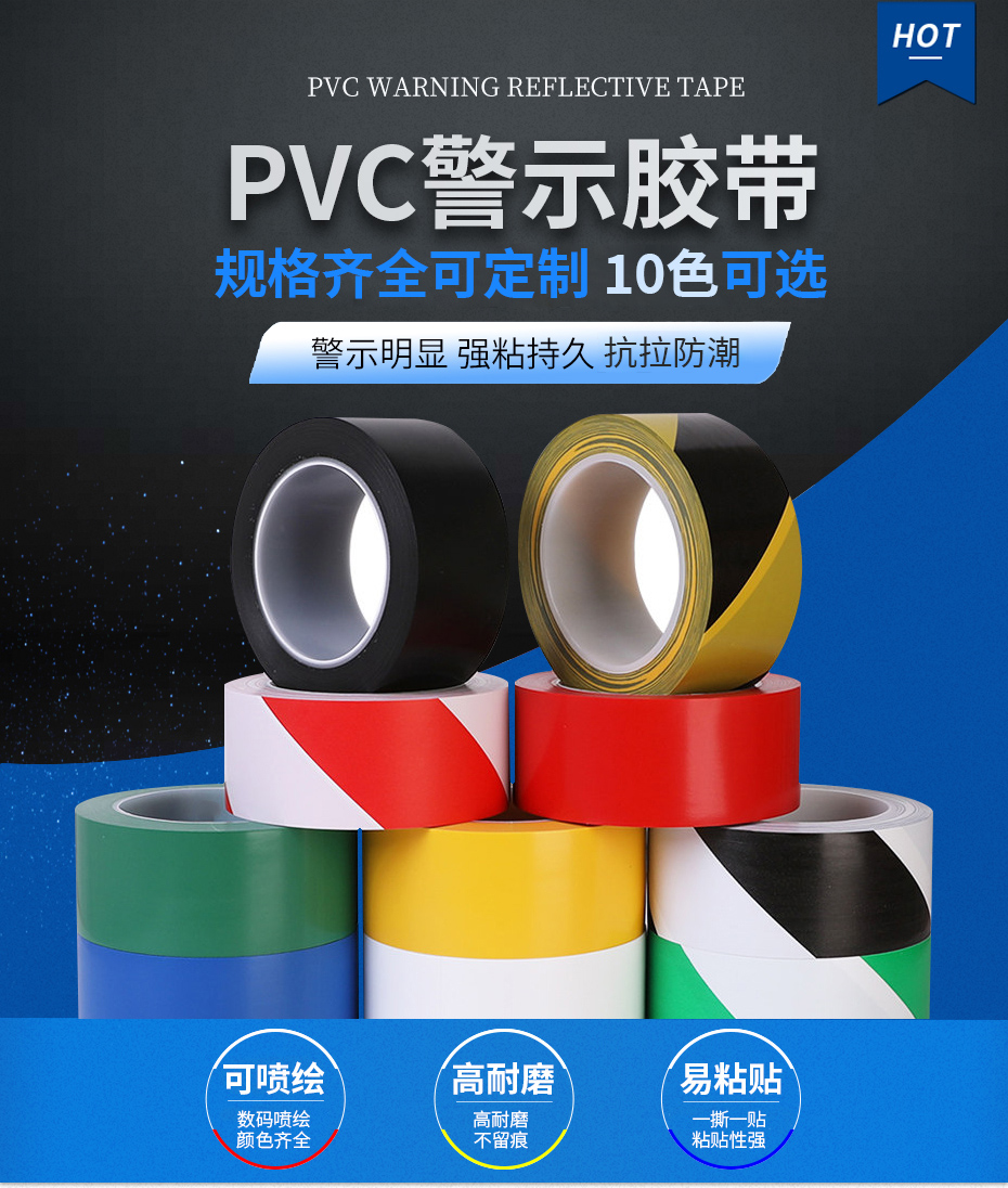 各(gè)種顏色警示膠帶(dài)均有,尺寸齊全,規格可按(àn)需定製