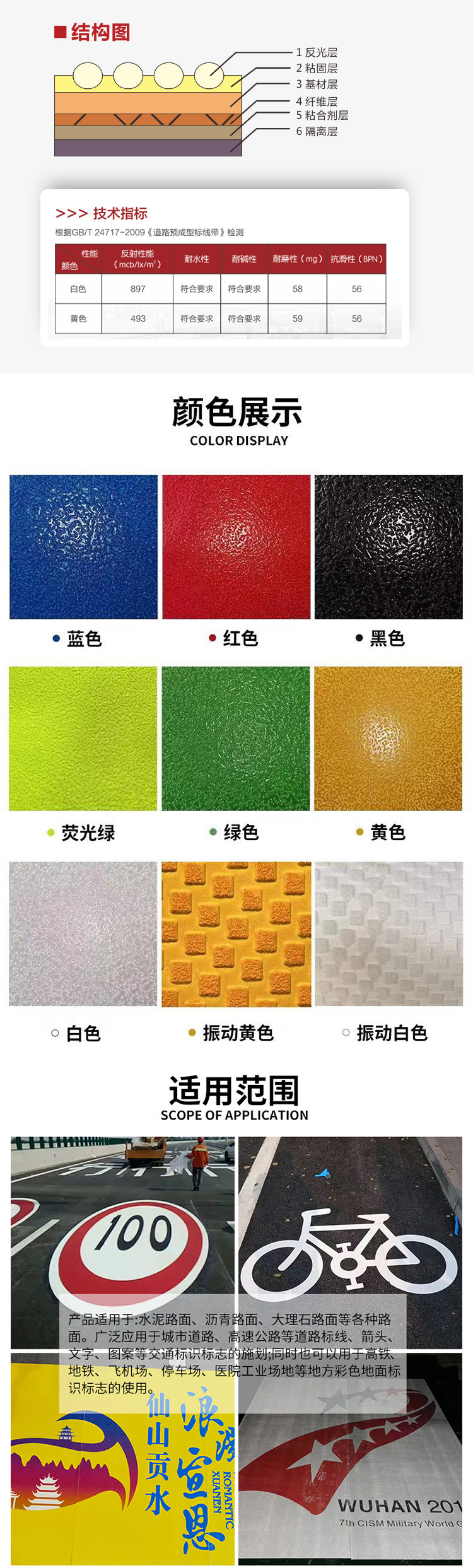 【產品(pǐn)特性(xìng)】良好的反光性能(néng),優異的耐(nài)候(hòu)性,施(shī)工(gōng)方便,能預成型各種標線和圖案,管(guǎn)道彩色(sè)標誌等