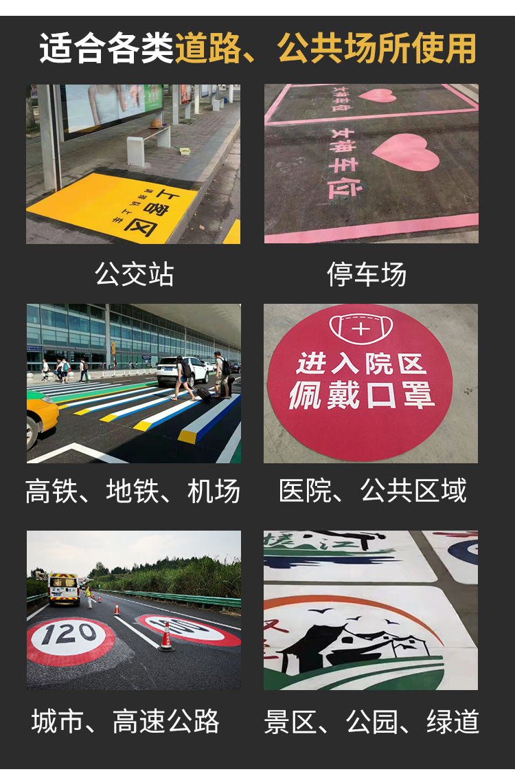 【產(chǎn)品應用】道路交通標線,文(wén)字,箭頭(tóu),圖形等;危(wēi)險地段(duàn)警示,碼頭,機場,收費站,停車場反光標識